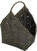 Laadukas ja kestävä kotimaisesta mäntyviilusta valmistettu puunkantokori nyt tyylikkään mustaksi/tummanharmaaksi maalattuna. Vahva pajuista punottu kantokahva.