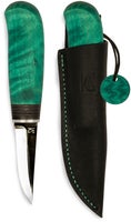 Puukon materiaalit henkivät lappilaista luontoa - puukon kahva on valmistettu suomalaisesta loimukoivusta ja läpivärjätystä koivuviilusta. Terä on helposti teroitettavaa hiiliterästä (80 mm, 80CrV2, HRC 59) ja alahela uushopeaa. Puukon kahva on viimeistelty vihreäksi käsin Kivalon pajalla.