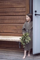 Lokoisa kylpytakki chambray-kanttauksilla ja -vyöllä. Kierrätyspuuvillaisille Kenno-saunatekstiileille on ominaista kankaan pehmeys ja eloisa tekstuuri.