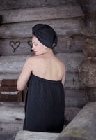 Rento Kenno -kietaisupyyhe on naisten saunapyyhe, joka kiinnittyy rinnan yläpuolelle tarranauhalla. Se on helppo ja mukava valinta saunan, suihkun tai uimisen jälkeen, kun haluat pyyhkeen pysyvän napakasti paikallaan.